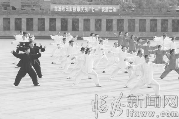 临汾新闻网讯 6月26日,身着红、黄、白、蓝等色彩服装的太极拳拳友在市区古城公园名人广场汇聚。当天,我市陈式太极拳协会在此举行庆七一表演活动。