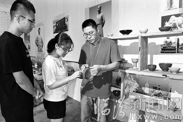 临汾新闻网讯 近日,临汾市首届艺术品品鉴交流会在临汾蓝色港湾文化创意产业园举行,此次展会由临汾蓝色港湾文化创意产业园和市妇联共同主办,吸引了大批文化名流、书画家、陶艺名家、收藏家前来参展、交流。展会期间,来自北京“宋庄”的各类艺术品与临汾本地特色艺术品一道向市民进行了展示,书画、珠宝、古玩、蛋雕、珐琅、雕塑、壁画、漆器、柳编等艺术品让市民一饱了眼福。图为我市陶艺名家段禹光正在介绍自己的作品。