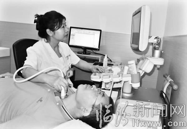 临汾新闻网讯 8月2日,在市和谐健康体检中心,工作人员在为客户做喉部B超检测。随着人们对健康理念的不断提升,越来越多的市民选择到专业的体检中心进行体检。为此,体检机构也推出了建立健康档案、个性化体检套餐等活动,让每一位受检人享受准确、专业的体检服务。