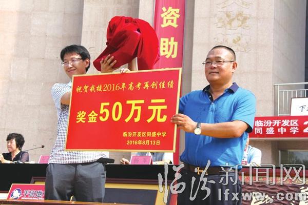 临汾新闻网讯 风和日丽庆贺高考佳绩,一诺千金助梦寒门学子。8月13日,临汾开发区同盛中学图书楼前锣鼓铿锵、人潮涌动,该校2016年高考庆功表彰大会在此举行,同时平阳房地产公司如期履行了“同盛中学每有一个考生考上清华或北大奖励100万元”的承诺,为该校刚刚考取清华大学的学子孙亚鹏慷慨解囊、助学圆梦。
