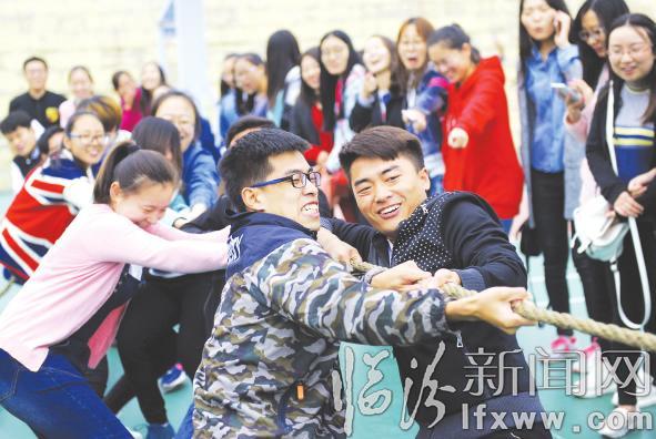 临汾新闻网讯 10月15日,山西师范大学的研究生参赛队员在进行拔河比赛。