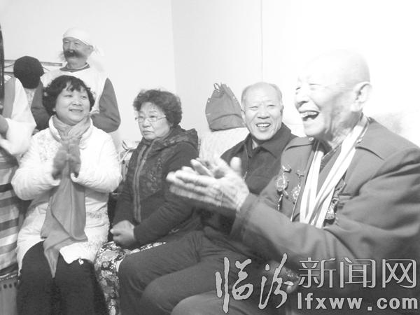 临汾新闻网讯 为纪念红军长征胜利80周年,10月25日,临汾市老龄办及临汾市老龄公益协会组织部分志愿者,专程到老红军梁斌家中看望他,表达了大家的敬意,并为他表演了节目。听着熟悉的旋律,梁斌高兴地和着节拍哼唱,老人脸上露出了幸福的笑容。记者 韩晓芳 摄