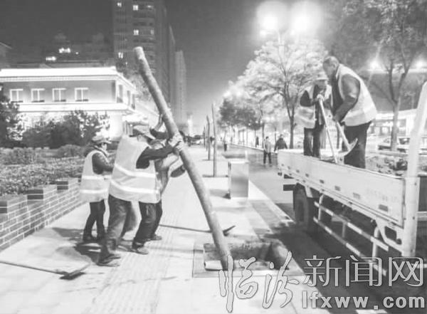 临汾新闻网讯 10月29日晚,临汾市城市绿化队的工作人员正在鼓楼南北街预留的树池栽树。据工作人员介绍,本次道路两侧共计栽植1200余棵国槐。冬天栽树是因为树木处于休眠期,新陈代谢较慢,抗寒性强,不易受冻害,树木的成活率远远高于春天。