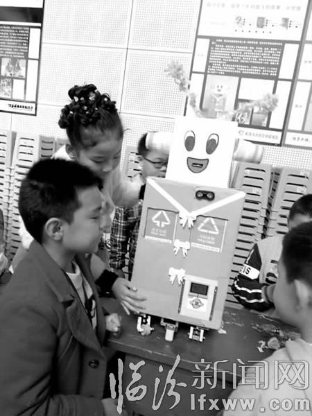 临汾新闻网讯 在日前举行的全市第二届青少年机器人竞赛现场,由翼城县三位小朋友设计制作巡逻环保小机器人受到来宾的关注。当人们投入饮料瓶、金属等可回收的垃圾时,机器人便会从嘴里吐出一角钱硬币作为奖励,并发出悦耳的音乐声。另外,机器人安装了摄像头,可以将信息输送到互联网中,游客可以通过互联网了解到景点的游客分布情况,从而调整自己的旅游路线。 记者 郭璞 摄