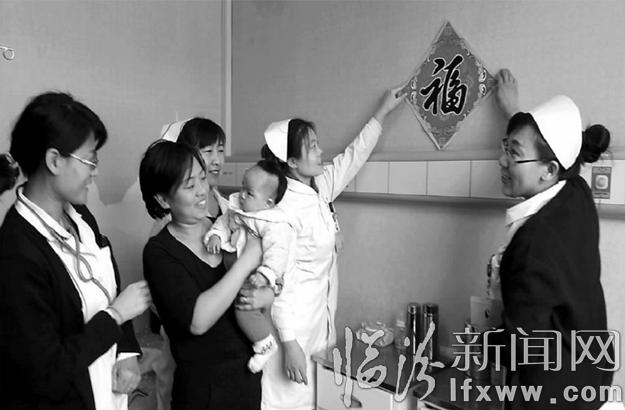 临汾新闻网讯 1月24日,是农历的腊月廿七,市第二人民医院儿科的医护人员仍然坚守在岗位上,关怀呵护着儿科的每一个小患者。图为护士长樊泽红带领护士们给病房里的小宝宝送来新春的祝福。