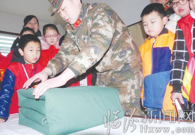 在参观部队内务时,看到战士们洁白的床单和豆腐块儿似的被子时,小记者们个个发出感叹。当武警官兵现场为小记者们展示“豆腐块儿”形成记时,在叠、按、切、捏之间,被子很快就成型,棱角分明。见状,小记者们开始跃跃欲试。很快,两位小记者搭档,在武警战士的指导下,开始叠被子,他们拿着一块木板,一点点抹平被子上的褶皱,随后将被子按照对折线进行折叠……小记者们特别认真,不放过每一个细节。