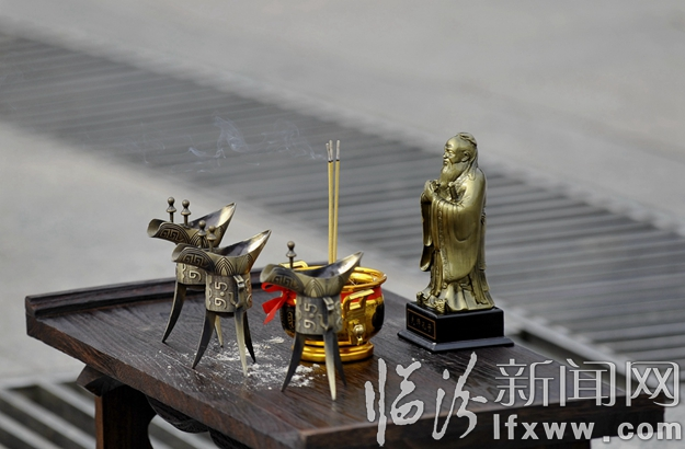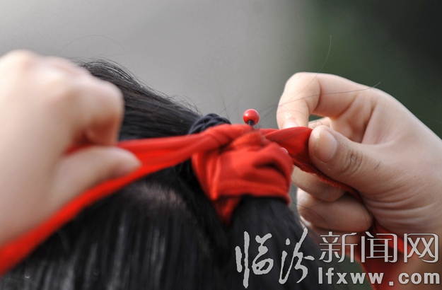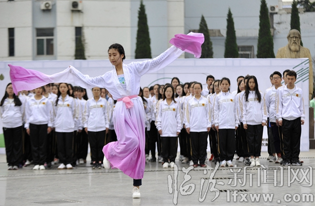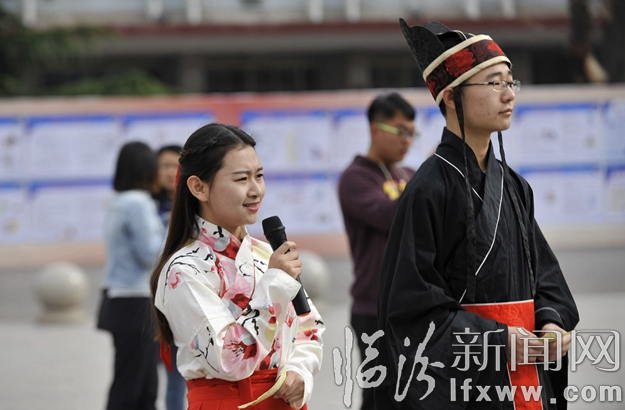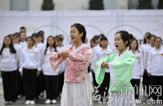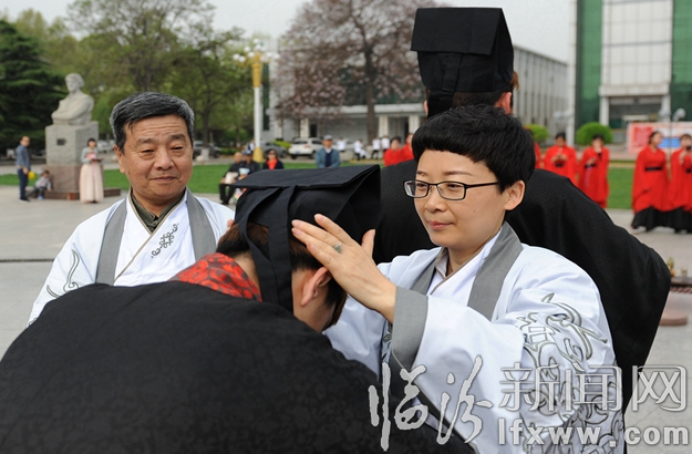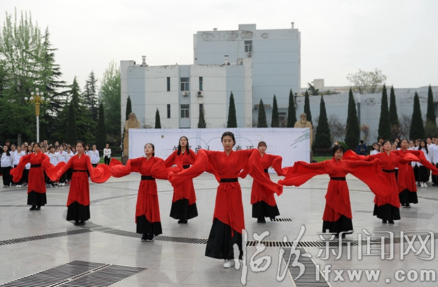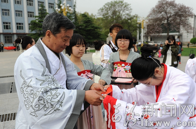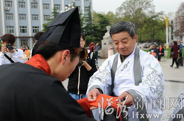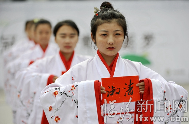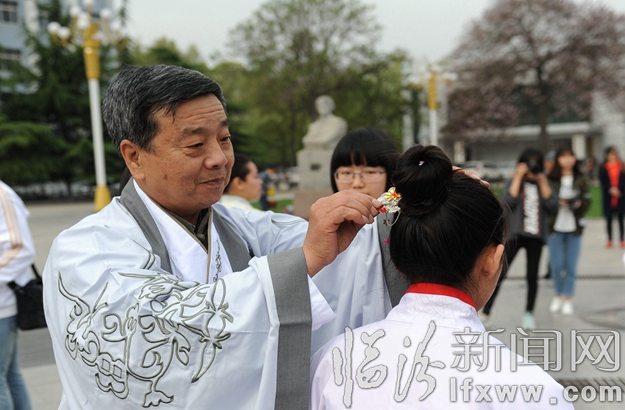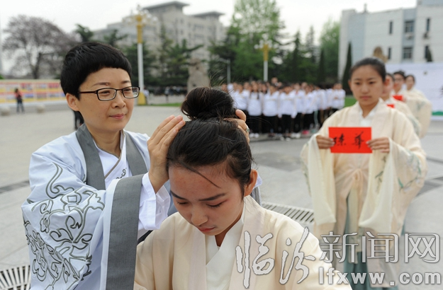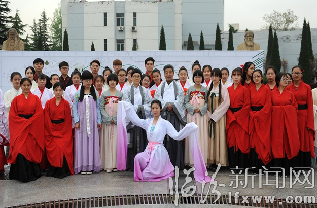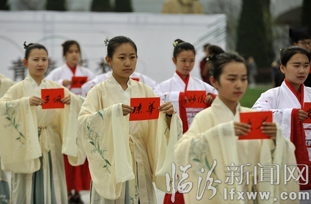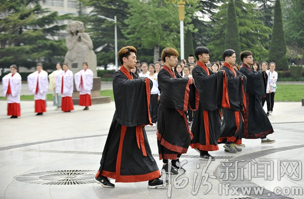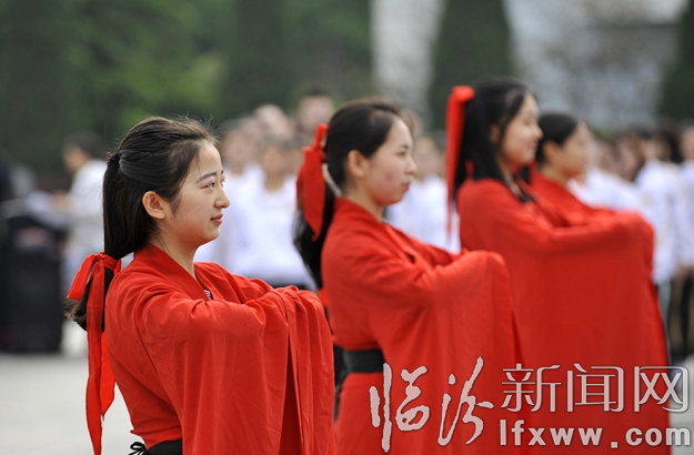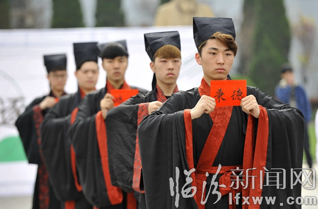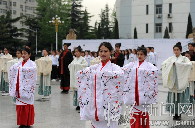 临汾新闻网讯 2017年4月15日,在山西师范大学巨人广场,朝歌汉服社的社团成员在进行汉服礼仪表演。当日,由山西师范大学美术学院主办、美术学院朝歌汉服社承办的以“筓冠成人,筑梦青春”为主题的中华传统汉服成人礼活动举办,通过展现男冠女笄的中华传统成人礼,使广大学生认识中国传统文化的内涵,提升个人综合素养,领略古代礼仪魅力,将传统文化与现代精神有机结合,激励大学生培养“仁义礼智信”的良好美德。