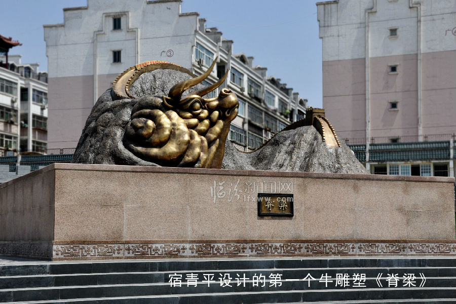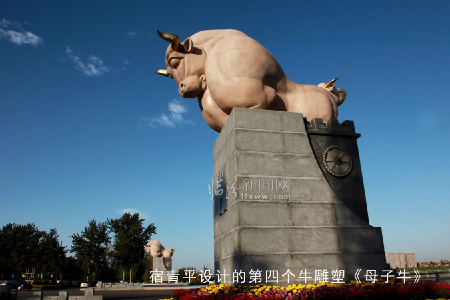 2012年,全市整治环境时,宿青平将脏乱的平阳桥头改造为四个桥头广场,设计建造了《母子牛》大型雕塑,寓意卧牛文化生生不息。这组雕塑镇守在平阳大桥两端,成为临汾历史上第一尊“镇河之牛”。