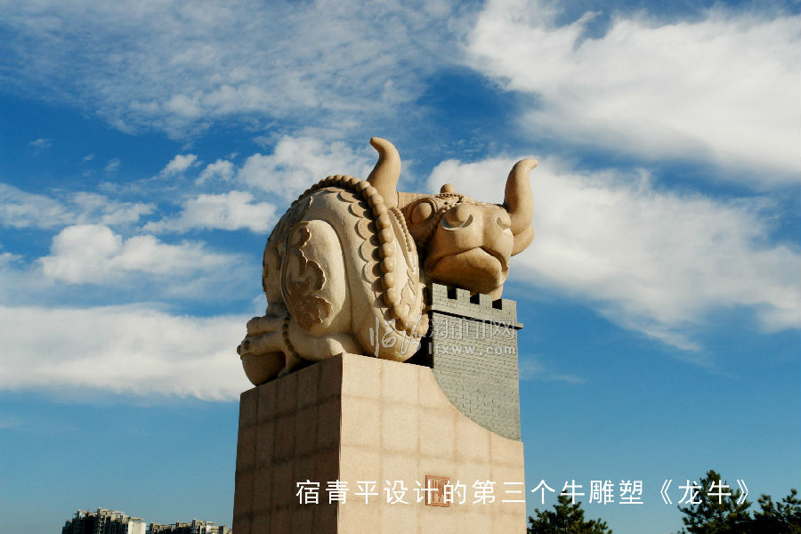 2010年,修建古城公园时,宿青平把中华“龙”文化与临汾“牛”文化相融合,取印章之型,创作了牛头龙身的《龙牛》艺术形象,这组雕塑矗立在古城公园西门两侧。