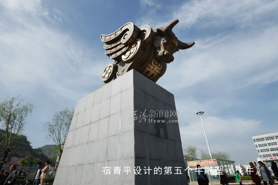 2014年,乡宁县为展示古城卧牛文化,特邀宿青平设计了《飞牛》铜雕,寓意面向未来、展翅腾飞。这尊雕塑矗立在乡宁老城的飞牛广场。