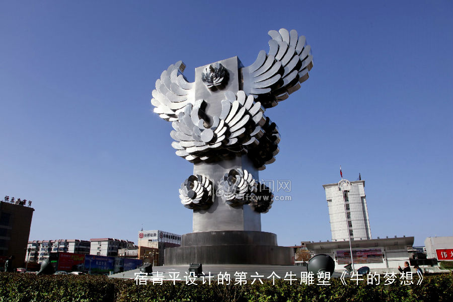 2015年,临汾机场竣工前夕,宿青平特意为机场创作了高达21米的《牛的梦想》不锈钢雕塑,如花如羽的艺术造型构成展翅腾飞的牛头图象,寓意临汾走向蓝天,凌空翱翔。因机场资金困难,缩小后安装于平阳广场。