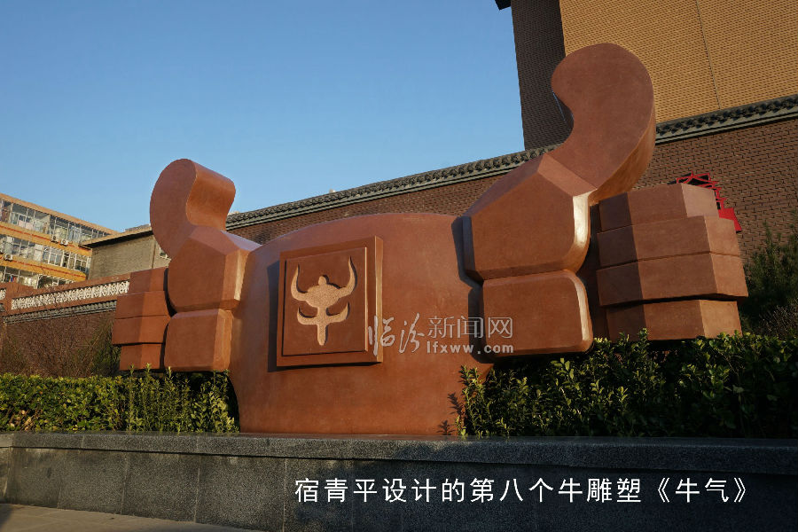 2016年,宿青平在设计鼓楼大街街景雕塑时,又创作了由双手构成牛头造型的《牛气》石雕,寓意临汾建设日新月异,令人点赞。这尊雕塑安装在鼓楼北侧的街头绿地。