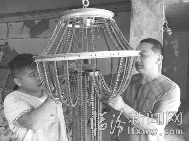 临汾新闻网讯 一根铅丝吊着废弃的电动车圈,中间有一个电灯口,其下方是一个废旧自行车钢圈,而连接它们的是一根根废旧的自行车链条。经过两个人的巧手编织,一堆废旧物成了一套美观大方的“豪华灯具”。6月4日,记者在鼓楼东大街一个装修场所看到了这样的情景。