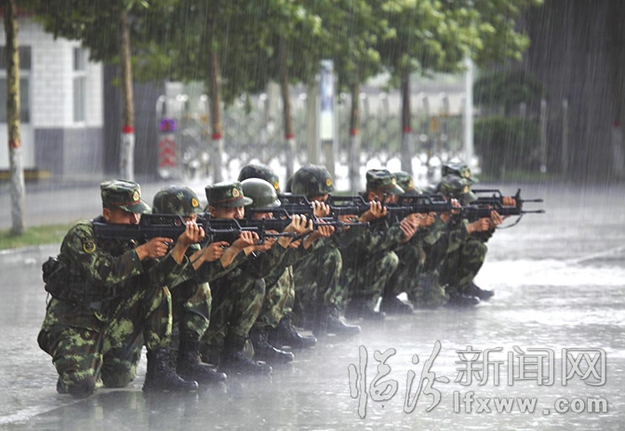 一分钟过去了,两分钟过去了……断续的雨滴顷刻变为瓢泼大雨。训练仍旧继续,此时记者手中的雨伞竟成了摆设,完全抵御不住雨水的冲击。