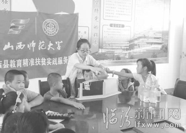 临汾新闻网讯 近日,山西师大236爱心社的大学生在吉县柏坡底村小学开展为期10天的教育扶贫活动,为山区儿童带来了丰富的文体、手工等课程,充实了他们的暑期生活,让学生们增长了见识,开阔他们的视野,取得了良好的效果。记者郝海军摄
