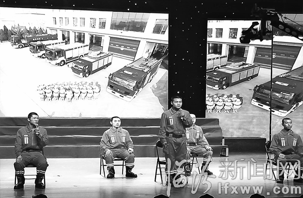 临汾新闻网讯 8月1日晚,临汾消防支队消防战士正在表演小品《忠诚》。当天,庆祝中国人民解放军建军90周年“军民鱼水情·共筑中国梦”文艺晚会在梨园堂举行。整场演出主题突出,形式新颖,感人至深,催人奋进,为消防官兵献上了一台精彩的“文化大餐”,谱写了一曲军爱民、民拥军、军民团结一家亲的动人乐章。