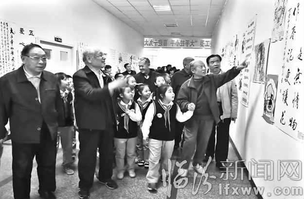 临汾新闻网讯 10月10日,由市关工委主办的“大手拉小手,喜迎十九大”书画展在市老年大学拉开帷幕。115幅书画作品表达了关工战线上“五老”同志热爱党、热爱祖国、关爱下一代的拳拳之心。图为市关工委领导与尧都区五一路小学的孩子们手牵手观展。
