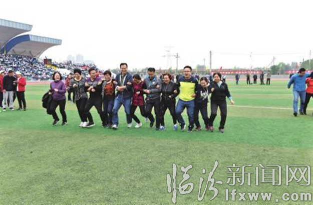 临汾新闻网讯 10月14日,经过两天半激烈角逐,临汾二中第六届中学生田径运动会落幕。本届校运会是对全校体育工作和师生综合素质的一次大检阅,展现了师生昂扬向上的精神风貌。图为校运会上教师趣味比赛项目“齐心协力跑”。