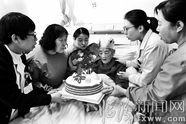 临汾新闻网讯 12月21日,临汾市第三人民医院开展了“关爱老人、产妇”温暖活动,他们给老人、产妇送上鲜花,还给耄耋老人送上蛋糕,祝福他们冬至日开心快乐。图为该院医养结合中心医护人员给住院的88岁杨素珍老人送去蛋糕祝福。