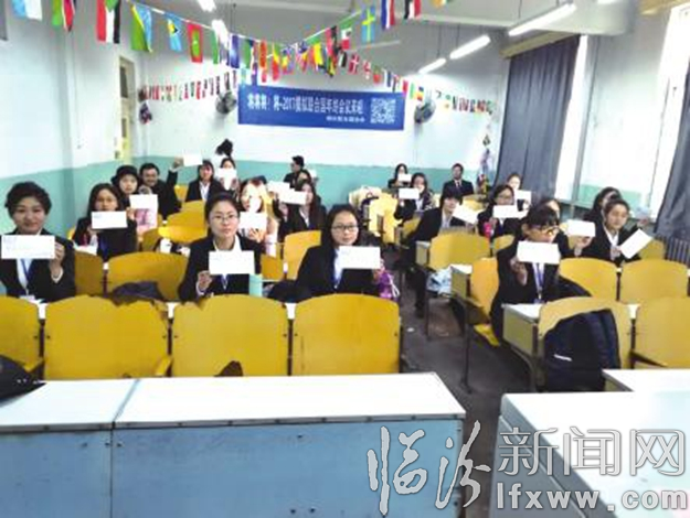 临汾新闻网讯 12月23日上午9时,山西师范大学教学楼205教室,陆续走进一群意气风发的年轻人:男生西装革履,女生高跟鞋、职业装,身上是他们所代表“国家”的标志牌,俨然一副“外交官”的打扮。记者好奇地打听,原来他们是来参加该校第五届模拟联合国年终会议的。
