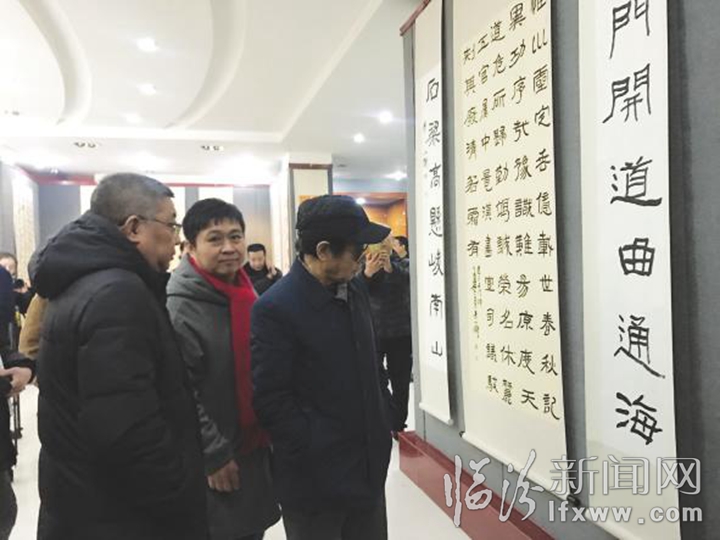他深有体会地说:书法没有捷径,只能日积月累。此次书法展是对我书法历程的一次回顾,也让我通过他人之长来弥补自己之短,继续脚踏实地地临摹经典名帖。”“在学习书法的过程中,不仅提升了个人的修养水平,也平和了自身的处世之道。对于书法艺术更深层次的理解,也帮助我在事业上有了更好地发展。”从事广告行业的郭金刚迷上了“跨界”,在国家、省级重大书法展览、赛事中,临汾书法从业者、爱好者已成为一支不容小觑的队伍,这展示了临汾作为华夏文明起源地的深厚文化底蕴,是临汾人的自豪。”前来观展的书画爱好者络绎不绝,令他们惊喜的是,亢金马的师父——著名书法家樊习一来到现场点评作品。师徒三代同堂,将传统艺术代代相传。