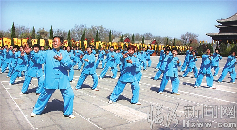 临汾新闻网讯 4月8日,临汾市杨氏太极拳协会临钢代表队一行30余人应邀来到洪洞,与洪洞大槐树文化中心代表队开展以“健康中国 太极同行,大槐树下 弘扬国粹”为主题的交流联谊活动。两地60余名杨氏太极拳习练者先后来到大槐树文化活动中心和大槐树寻根祭祖园,以集中表演和交流展示的方式,表演了杨氏太极拳26式、太极韵和太极扇。