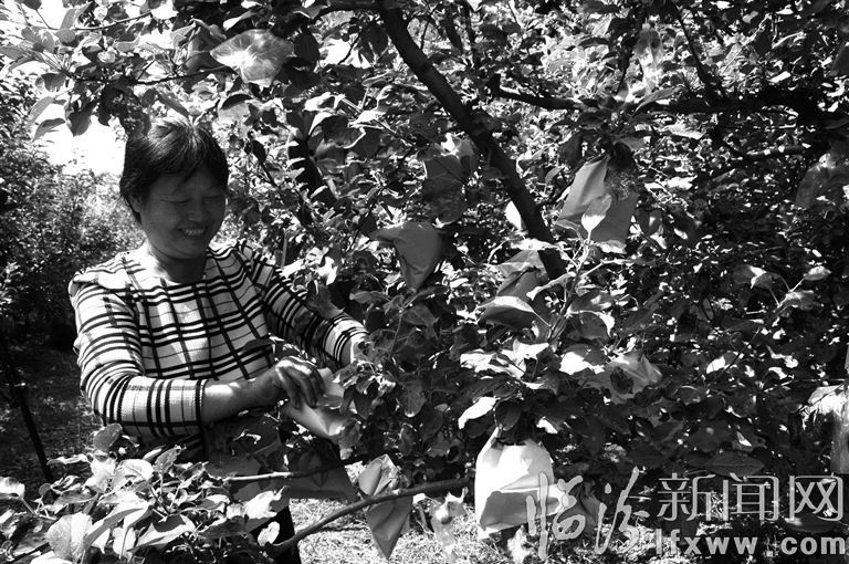 眼下正值苹果套袋关键期,襄汾县景毛乡村民李莲香和过来帮忙的果农起早贪黑忙碌着。据了解,李莲香家苹果种植采用塑膜加纸袋的方式,每亩地可收入9000元左右。(王璐 摄)
