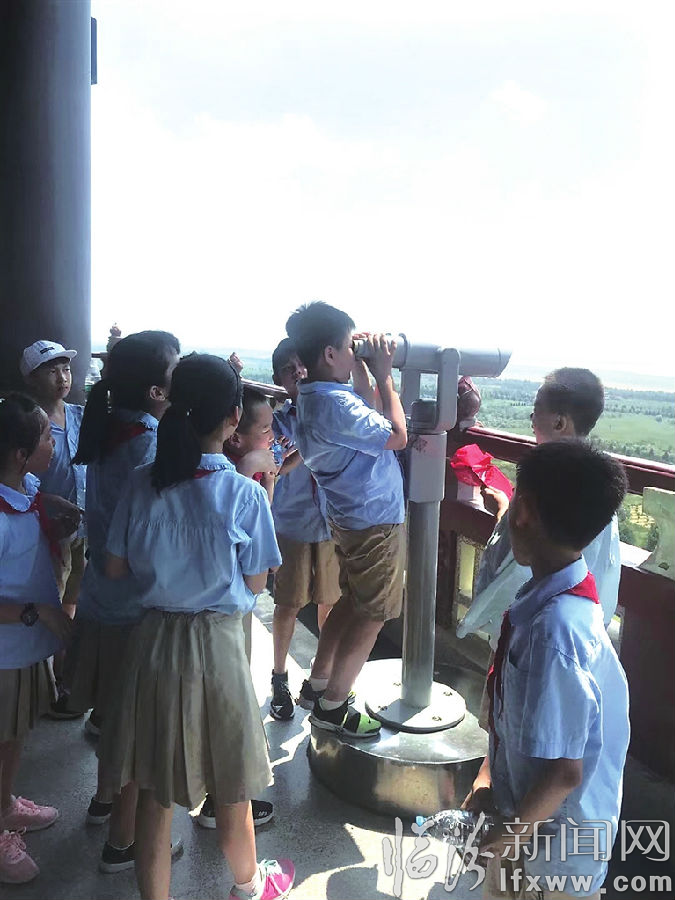 暑假期间,尧都区解放路小学五九中队的同学们在班主任老师的带领下,踏上了南下研学之旅。他们来到永济鹳雀楼、解州关帝庙,了解这些景点的历史渊源、文化底蕴。研学之余,同学们还自编自演了竞赛游戏,享受美好的假日时光。图为同学们登上鹳雀楼,通过望远镜欣赏周边的秀丽风景。(尧解 摄)