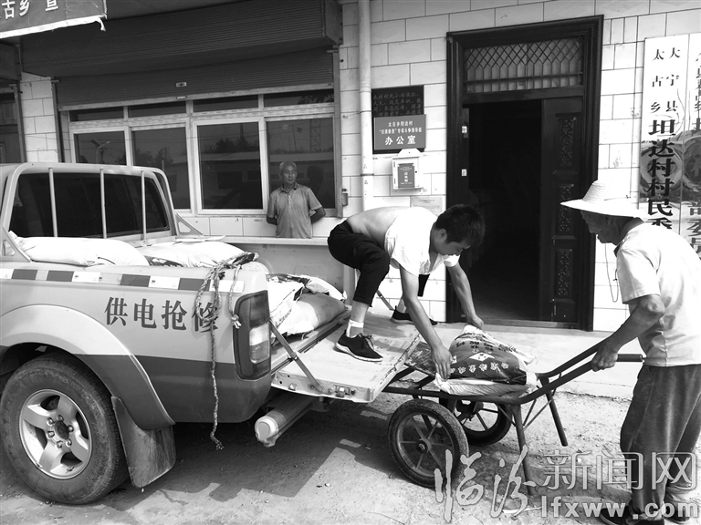 近日,大宁县林业局为太古乡坦达村村民发放核桃树提质增效化肥300余袋。正当村民们考虑化肥的运输问题时,该电业局驻村工作队长李伟想农民所想,解农民之愁,每天开工具车从县城专程为村民捎拉,解决村民的实际困难。图为电业局工作人员正帮助70多岁的农民搬运化肥。(冯振兴 摄)