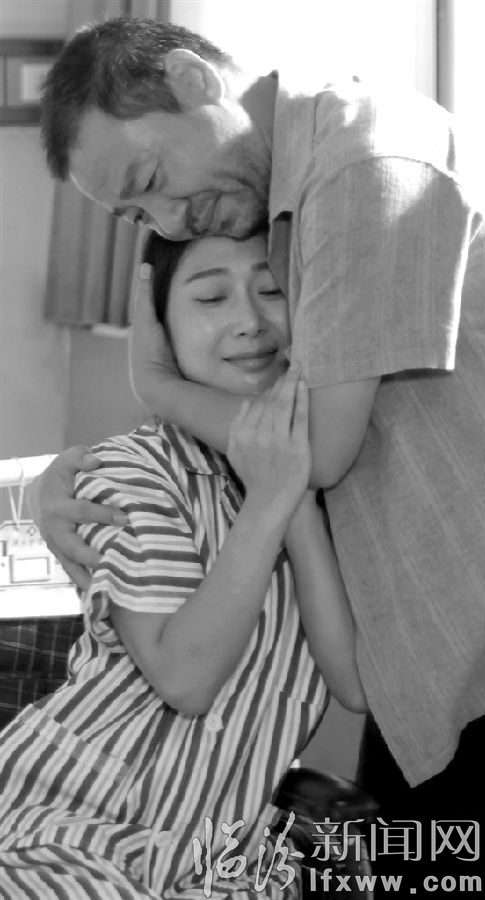 病床前,父亲牛耕田(潘国梁 饰)与养女牛小春(王倩 饰)真情相拥,诠释人间大爱。杜建东 摄