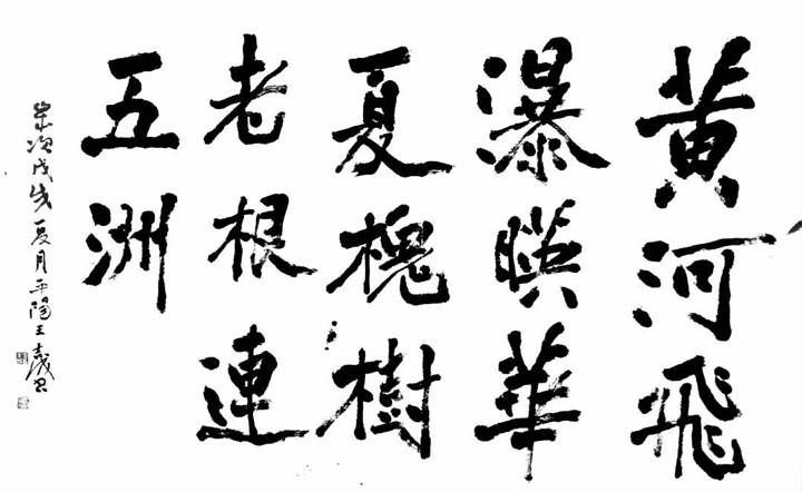 言者,心声也。书者,心画也。王吉成将情感诉诸笔端,将至爱化为神奇。他深有感触地说:临汾美景,天下闻名,谁人不知,临汾吉县有个壶口瀑布,水底冒烟、旱地行船,霓虹戏水、山飞海立,晴空洒雨、旱天惊雷、冰峰倒挂、十里龙槽等8大奇观令全世界叹为观止。古往今来,多少文人墨客在这里留下千古佳句,最广为人知的便是‘黄河之水天上来,奔流到海不复回’。提笔之时,我脑海中便浮现‘黄河飞瀑映华夏’。”壶口瀑布闻名世界,华人老家”连接五洲。王吉成接着道出:问我祖先在何处?山西洪洞大槐树。祖先故居叫什么?大槐树下老鹳窝。凡是有华人的地方就有古槐移民后裔。600年前,一场声势浩大的移民使大槐树成为亿万华人魂牵梦绕的精神家园;600年后,大槐树用无数个天下之最召唤着最亲的人,牵引 着五湖四海的移民后裔前来寻根祭祖。”流淌千万年的黄河开启中华文明,延续600年的“大槐树”绵延华夏亲情。从王吉成写下的这副楹联,可以感受到笔笔情真、字字意浓。在他心中,家乡临汾物华天宝、地灵人杰、民风淳朴,是华夏始祖的起源地,也是母亲河黄河心脏跳动的地方,更是全球华人共同的老家。