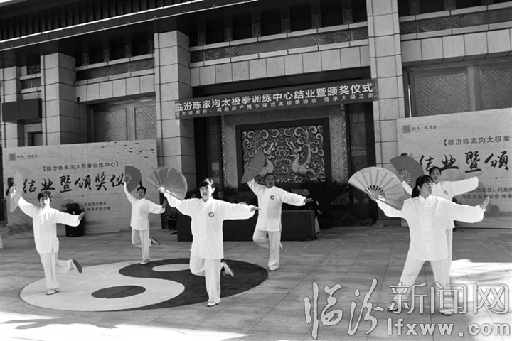 临汾新闻网讯 10月28日,临汾陈式太极拳拳友在进行太极扇表演。当日,临汾陈式太极拳协会走进市区恒大悦龙台小区,举办第四期陈式太极拳学员结业仪式,并与恒大集团悦龙台项目部建立长期战略合作关系,旨在通过太极拳走基层、进社区,进一步弘扬太极文化、丰富群众文化生活。