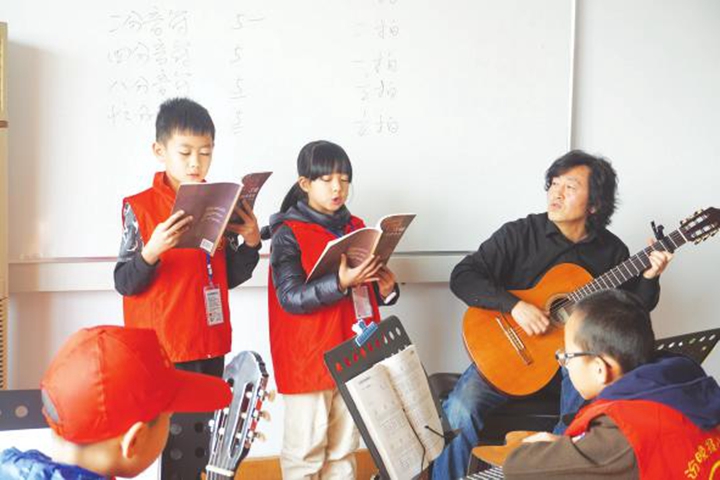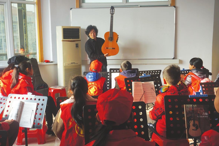 “吉他的构造不算复杂,有琴头、旋钮、指板、品丝、音孔等。初学阶段一般用坐姿,先将右腿踩在小凳子上,再将琴箱最凹处放在右腿上,琴箱背部抵在身体……”杨老师从基础开始,一步步教授小记者们认识六线谱并简单掌握弹奏方法。