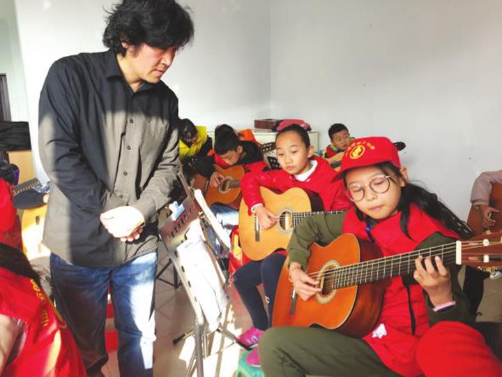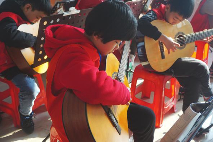 在杨老师的耐心指导下,小记者们一次次地试着拨动琴弦,单调的音符逐渐组成有节奏的旋律。虽然弹奏还很稚嫩,但他们已经为自己所取得的进步开心不已。有些功底的小记者郭雨桐脱颖而出,在杨老师的鼓励和配合下,她依次弹奏了《小星星》《爱的罗曼史》《送别》等。她兴致勃勃地说:我喜欢唱歌和弹吉他,因此成为班里的文艺骨干。这大大增强了我的自信心和学习积极性,我会将这一爱好坚持下去。”琴声悠悠,引得小记者们情不自禁跟着旋律轻轻哼唱,现场气氛顿时嗨起来。杨老师借机告诉大家:吉他的趣味性、娱乐性很强,能带给人愉悦的享受。学音乐不仅不会影响学习,而且是一种好的休闲方式。练习时一定要求稳,不要急于求成。”随后,现场开起了“演唱会”,拨动心弦的琴音、清澈透明的童声完美演绎歌曲《童年》。