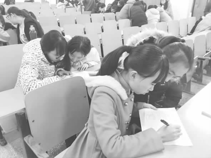 笔试环节,各小组间进行组内合作答题,小组中的人虽然有的互不相识,但都齐心协力,共同作答。答题结束后,各组交换试卷,进行评分,成绩最高的八组晋级第二轮抢答赛。