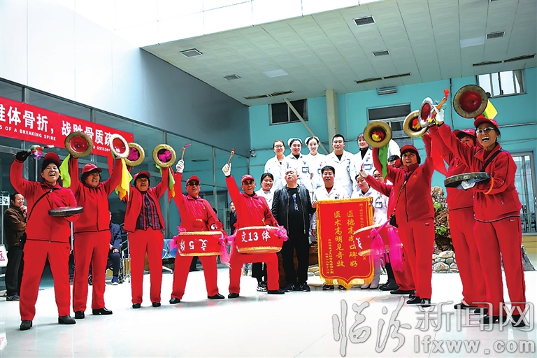 11月5日,来自洪洞县淹底乡孔峪村的邢小刚夫妻手捧烫金锦旗,在锣鼓队热热闹闹的陪伴下,来到市第三人民医院康复科,将书有“医德高尚口碑好医术高明见奇效”的锦旗送至该科负责人手中,以表达内心的感激之情。两个月前,邢小刚因脑干出血导致面部、双腿和双臂失去知觉,在市三院康复科经两个月的康复治疗后健康出院。王辉耀 摄