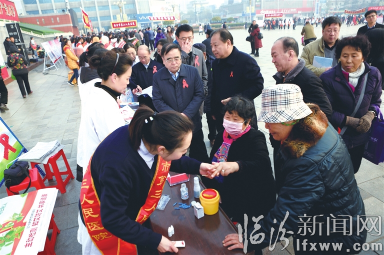 12月1日,是第31届世界艾滋病日主题宣传活动日,今年的主题是“主动检测知艾防艾共享健康”。市卫计委组织卫生系统医护人员举行了大型宣传活动,为市民普及防艾知识。图为宣传活动现场。(王辉耀 摄)