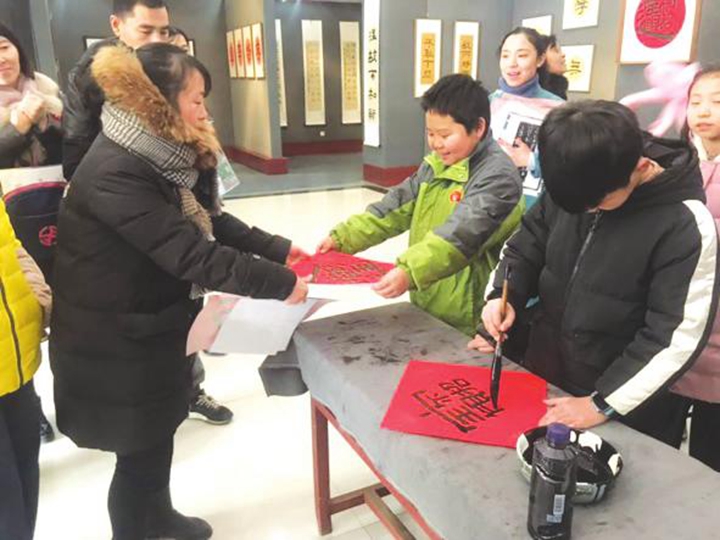 尽管深冬季节天气严寒,展厅内却洋溢着温暖祥和的气氛。小参展者们现场挥毫泼墨,为过往市民义务书写“福”字,送上新春的美好祝福。