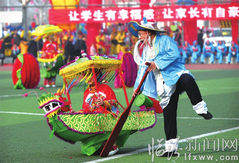 由初中二部近百名学生带来的《河汾晓春》,花壳绿衣掌的河蚌姑娘俏皮可爱,白髯飘飘的艄公与端“坐”船中的彩衣娘子动作相随,犹如船行水上。在圆梦二部学生带来的《跷脚踏春》中,脚踩高跷的孔老夫子携着一众门生高吟“学而时习之”,与四大名著的经典人物鱼贯而行,引起了台下学生们的阵阵欢呼。