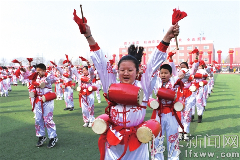 初中部150名学生组成的表演队伍,红装艳裹,舞步轻盈,以《鞭花打春》把霸王鞭这种流传于我省境内的民间舞蹈形式奉献给了现场观众;初中一部50余名学生带来的《跃马催春》则再现了竹马这种风行于我省城乡的传统民俗活动形式;初中二部一年级500名学生的秧歌《锦绣舞春》和二年级300名学生的云龙花鼓《花鼓迎春》轮番登场,同样好不热闹。