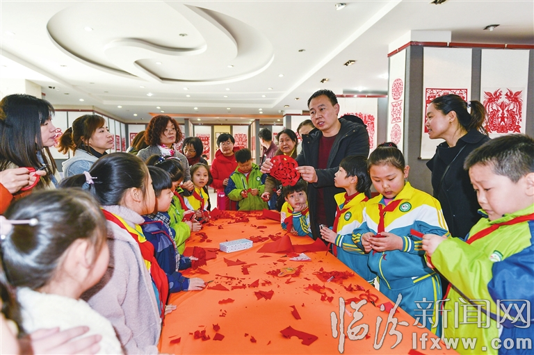 二月二十五日,在临汾市二O一九年剪纸作品展上,浮山县剪纸协会会长张宁在为孩子们讲解剪纸的要领。临汾市剪纸作品展在群众艺术馆开展以来,为广大群众奉献了一个绚丽缤纷的艺术视觉盛宴。展览期间,主办方适时开展了“剪纸科普课堂”,吸引了众多学生和剪纸爱好者参与,取得了良好的社会反响。记者 闫锐鹏摄