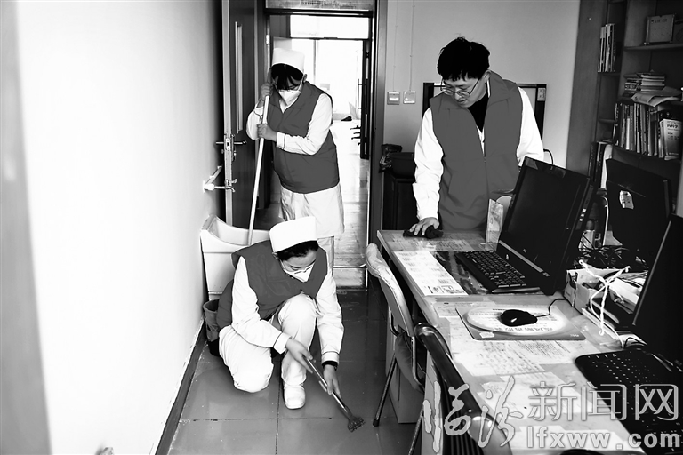 3月3日,在市第三人民医院传染病区,该院的红马甲学雷锋志愿队队员们打扫、擦洗、清理着刚刚装修完毕的办公区域。志愿队由该院的医护人员组成,利用周日休息时间参加义务劳动,以实际行动纪念“向雷锋同志学习”发表56周年。王辉耀 周庆丰 摄