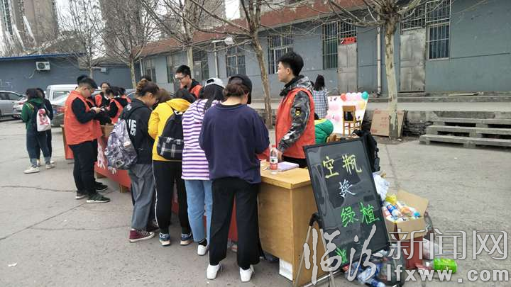 临汾新闻网讯 为提高大学生的环保意识,传递绿色正能量。山西师范大学现代文理学院青年志愿者联合会于2019年3月21日在学院康庄广场举办了“空瓶换绿植”活动。