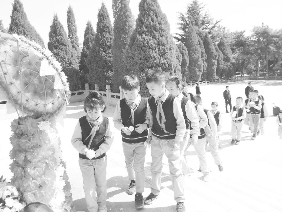 当天下午,同学们排着整齐的队伍走进庄严肃穆的临汾烈士陵园。他们先是瞻仰徐向前元帅的铜像,接着在刻有“革命烈士永垂不朽”的纪念碑前向革命烈士致哀,行三鞠躬礼。随后,全体人员合唱《少先先锋队队歌》,同时向革命烈士敬献花篮。