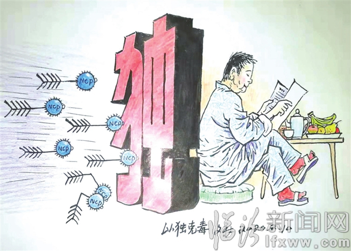 “同一题材的创作,关键要立意准确、角度新颖,然后再考虑怎么表达,比喻、象征、夸张、双关等形式多样。例如,这幅作品就是运用‘双关’的方式去表现的。”他拿着一幅《以“独”攻毒》举例,“独”字为墙体,代表分界线,将宅在家中看报纸的青年人与病毒隔离开来。“疫情防控,人人有责。‘宅’起来,脚步虽然暂停,但充实丰富的精神文化供给却并没有缺位。”柳文社说。