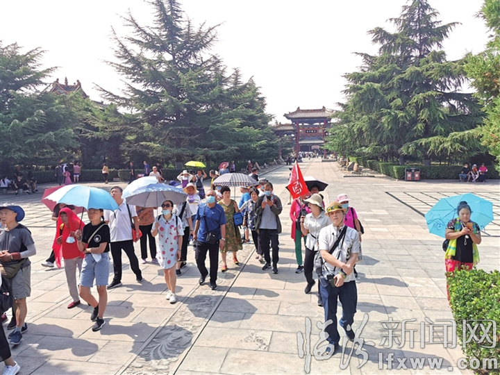 临汾新闻网讯 8月3日10时许,尧都大道上,操着山东口音的游客们陆续走下停靠在道旁的大巴车,在执旗导游引领下涌向不远处的尧庙和华门景区……