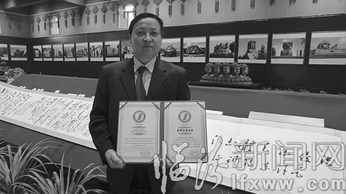 张俊山创作的《毛泽东诗词》正反书长卷自2012年10月至今年6月完成,长为128.14米,宽为0.62米,创世界纪录协会最长的毛体书法正反书卷世界纪录。