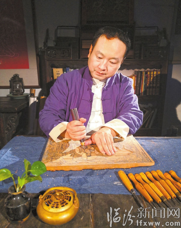 沿着临街的巷子进入,一间外观普通的民宅里,40岁的王军屏气凝神,移指推刀。刀痕流转,余木轻起。他面前的案头上,一枚纹理若现的木板,时而跳跃出与之对话的文字。