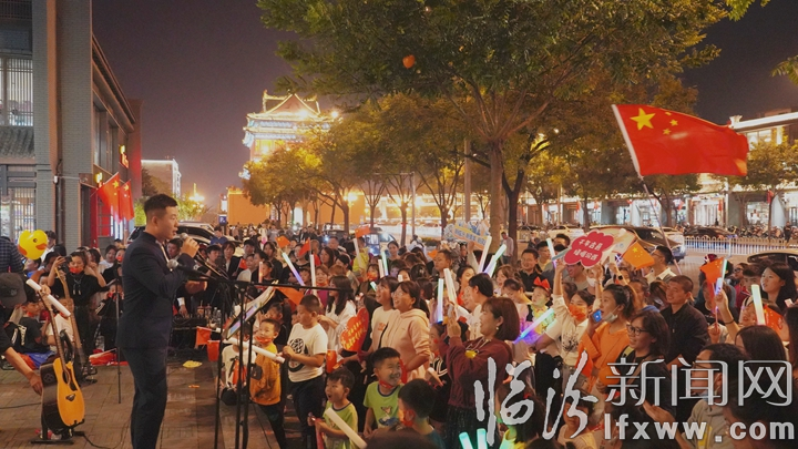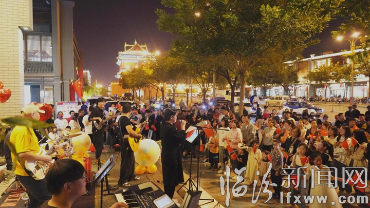10月2日晚7时,“其实临汾很动听”庆国庆汾西专场活力开唱。来自汾西的20余名青年来到市区鼓楼打卡墙处,用歌声讴歌时代,祝福祖国母亲生日快乐。