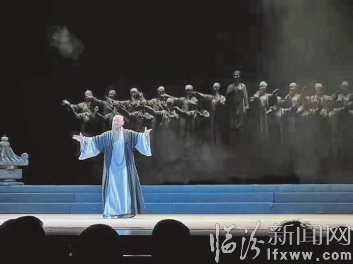 7点半,幕布在苍凉的伴唱中徐徐拉开。舞台呈现出的视觉冲击力,瞬间把观众带入了洪洞广胜寺真实的情景中。霍山之巅,寺院翠柏环抱,殿堂宽宏伟严,飞虹塔高耸入云。悠远的钟声过后,笙管丝竹渐起,木鱼铜磬和鸣,庄重肃穆,摄人魂魄。大雄宝殿前,力空法师率寺院众僧面佛而坐,虔诚咏颂。数名香客双手合十,悉心参悟。佛门宝刹声名远,普度众生结佛缘。